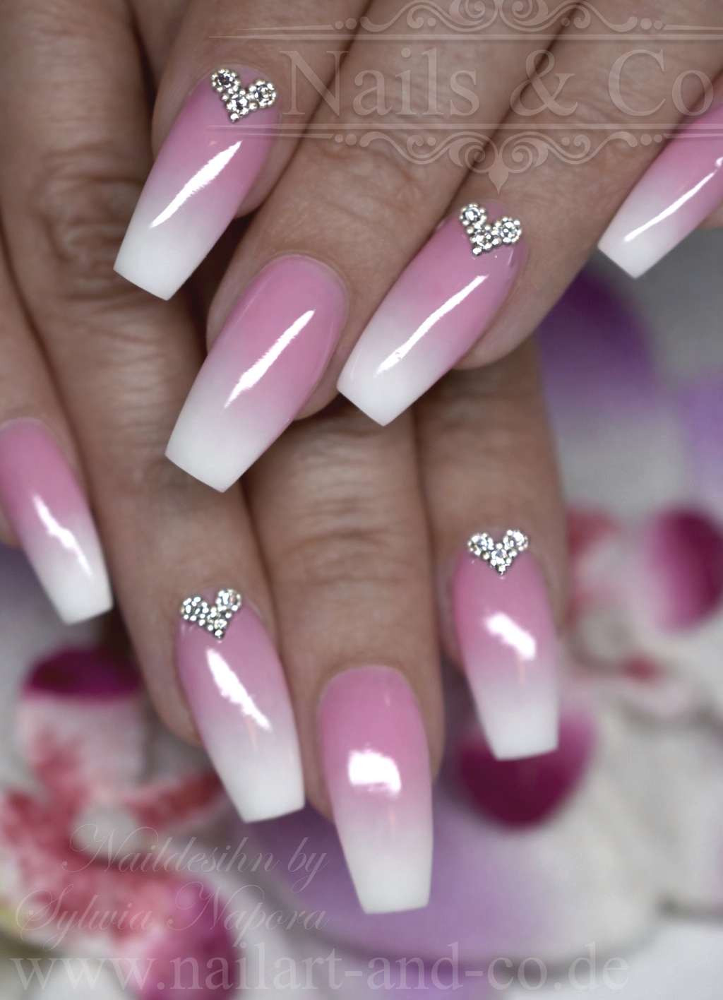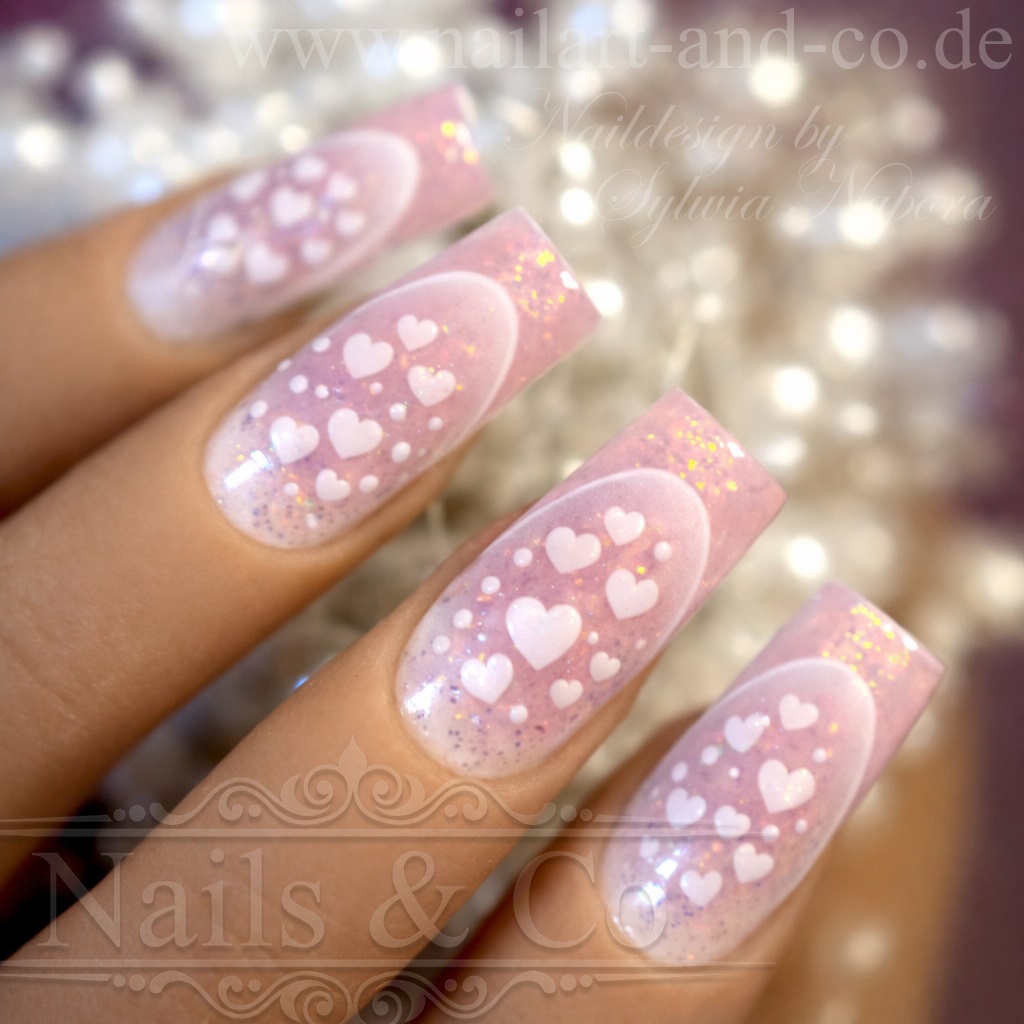 Zart, verspielt und doch modern – diese Outlines-Nägel verzaubern mit einem hauchzarten Verlauf in Rosa und Weiß, kombiniert mit funkelnden Effekten und süßen Herz-Details. Der fein gearbeitete Outline-Look sorgt für Tiefe und Eleganz, während die schimmernden Partikel jedem Finger ein Hauch von Magie verleihen. Perfekt für alle, die zum Valentinstag Liebe bis in die Fingerspitzen tragen möchten.