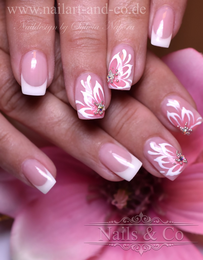 French sieht nicht nur pur gut aus. Kombiniert mit üppigen Blüten und Strass-Kristallen lassen sich mit French wunderschöne Nail Art Designs gestallten.
