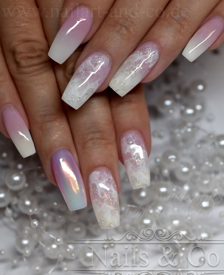 Dieses Design verbindet feinste Marmoroptik mit irisierenden Aurora-Chrome-Effekten – ein luxuriöser Look, der Sanftheit und Eleganz ausstrahlt. Die zarten Weiß- und Rosétöne schmeicheln jeder Hand und machen dieses Nailart zu einem perfekten Begleiter für Hochzeiten, festliche Anlässe oder einen Hauch von Everyday-Glamour.