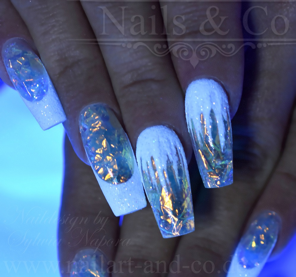 Fire & Ice Nails. Ein Design wie aus einer anderen Welt: Fire & Ice Nails verbinden schneeweiße Eleganz mit irisierendem Eis-Effekt. Die funkelnden Glanzstückel reflektieren goldene und blaue Lichtspiele, die an tanzende Polarlichter erinnern. Der feine Glimmer sorgt für eisige Klarheit, während die fluoreszierenden Elemente den Look in eine geheimnisvolle Aura hüllen. Perfekt für Partynächte, Events unter Schwarzlicht oder einfach für alle, die sich gern außergewöhnlich zeigen. Fire & Ice Nails ist nicht nur ein Naildesign – es ist ein Lichtspiel in Perfektion.