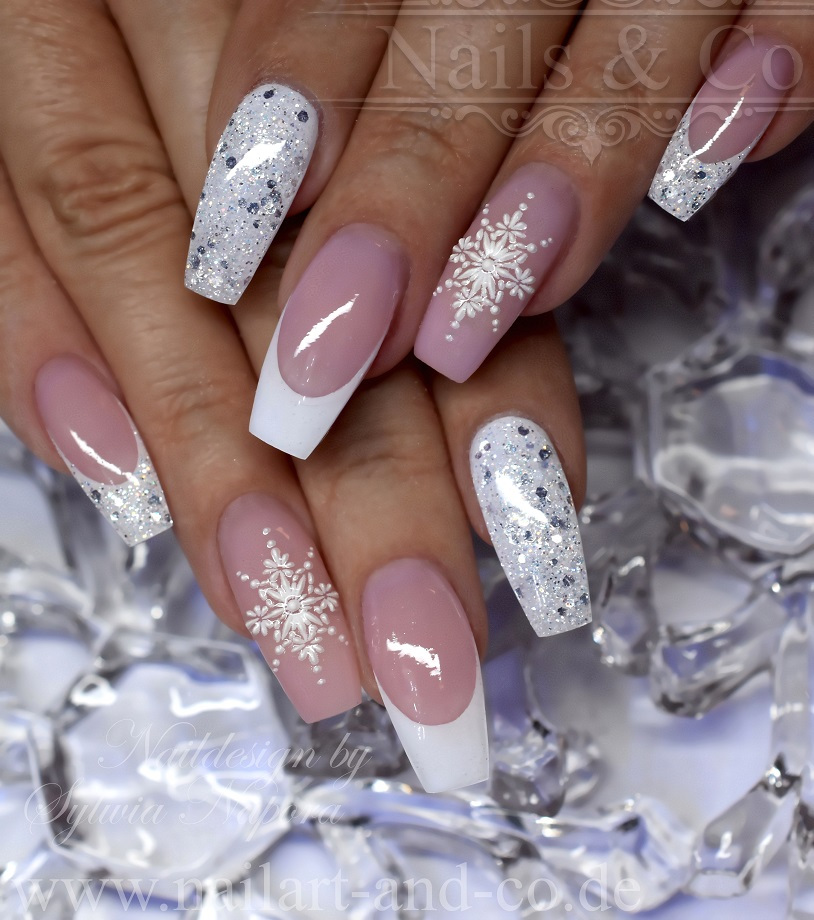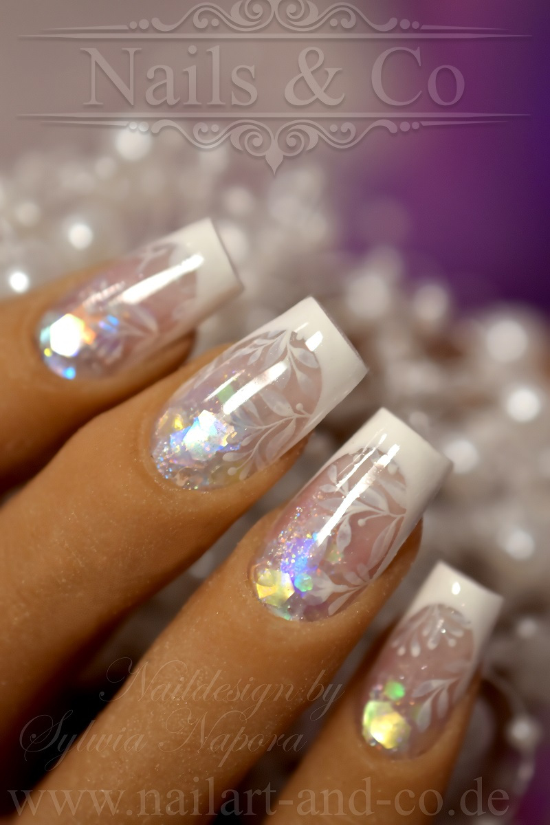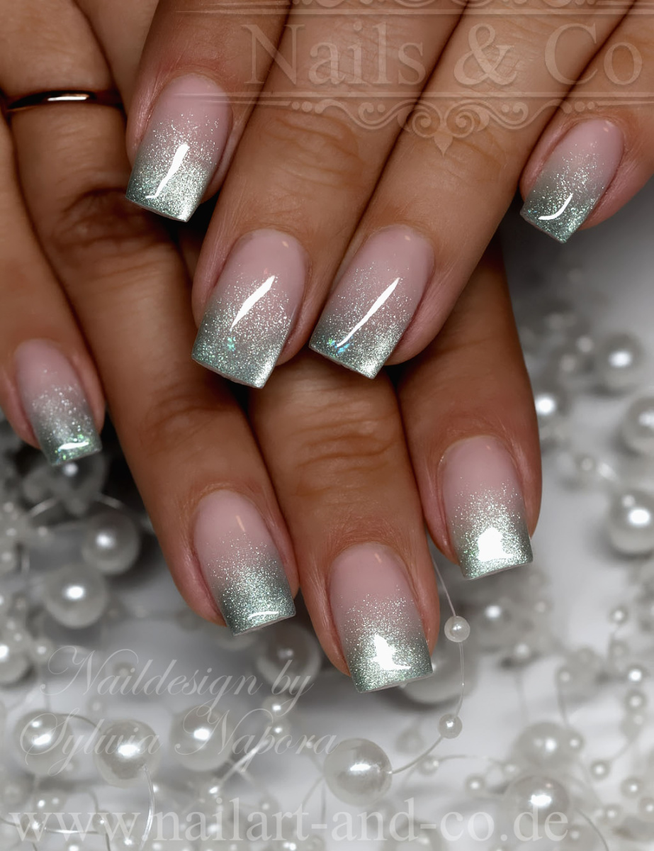Ein zeitloser French-Look neu interpretiert Dieses elegante Nageldesign kombiniert klare weiße Spitzen mit einem sanften Farbverlauf und glamourösen Silberakzenten am Nagelbett. Der feine Schimmer des Metallic-Glitzers sorgt für einen Hauch von Luxus – dezent, aber wirkungsvoll. Ob für festliche Anlässe oder einfach als stilvoller Alltagsbegleiter – diese Frenchmodellage vereint klassische Schönheit mit modernem Glanz. Ein Look, der in jeder Jahreszeit glänzt.