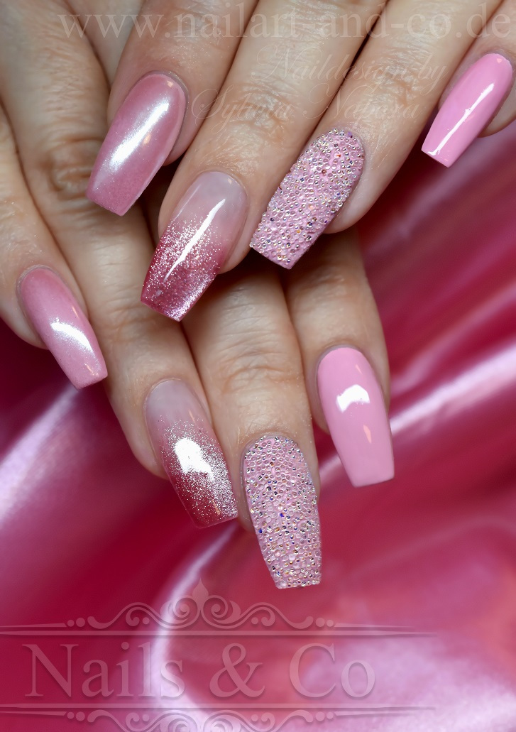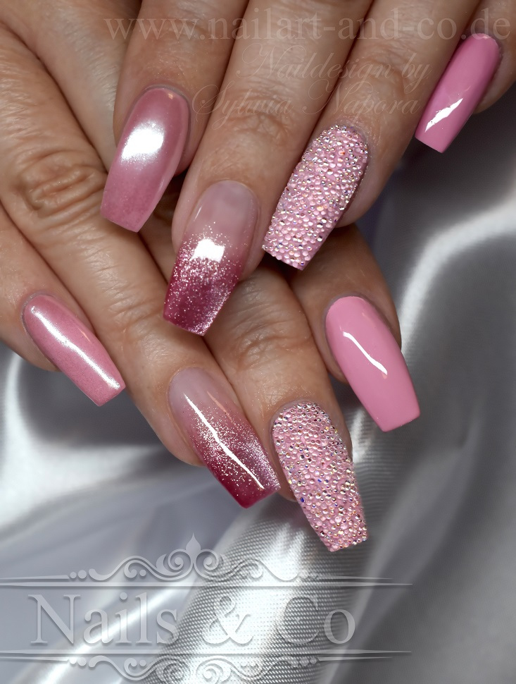 Dieses Nageldesign ist eine Hommage an die Schönheit der Farbe Rosa – zart, modern und mit einem Hauch Luxus. Die Nägel sind in unterschiedlichen Rosatönen gestaltet: von schimmerndem Perlglanz über sanften Glitzerverlauf bis hin zu glamourösem Fullcover mit funkelnden Mini-Strasssteinchen. Die Kombination aus verschiedenen Texturen und Finishes sorgt für einen aufregenden, aber dennoch harmonischen Look. Die elegant modellierte Form unterstreicht die feminine Ausstrahlung dieses Designs – ideal für romantische Anlässe, besondere Events oder einfach für alle, die sich ein bisschen Prinzessinnen-Glamour im Alltag wünschen.