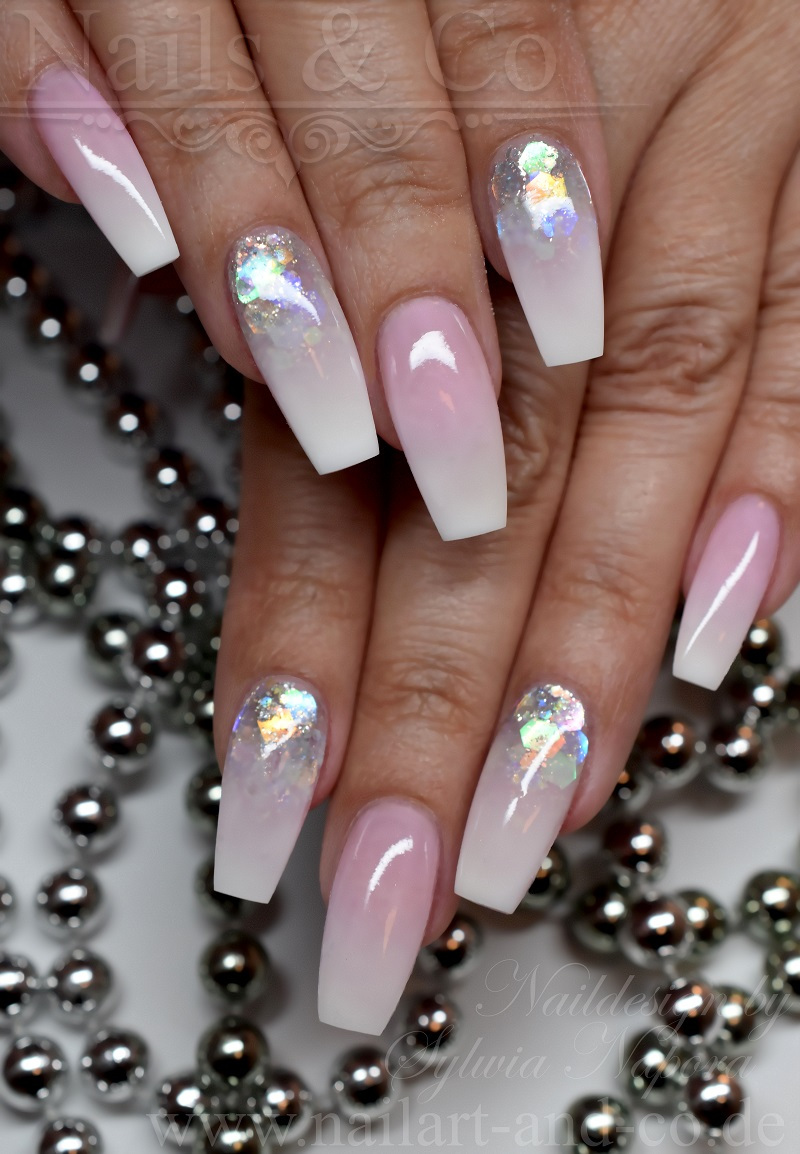 Dieses edle Nageldesign begeistert mit einem klassischen Babyboomer-Verlauf in sanftem Rosé und Weiß – veredelt durch faszinierende Glanzflakes in schillernden Regenbogenfarben. Die schimmernden Akzente fangen das Licht bei jeder Bewegung ein und verwandeln die Nägel in echte Hingucker – glamourös, ohne aufdringlich zu wirken. Iridescent Dream ist wie geschaffen für Bräute, besondere Events oder alle, die dezenten Luxus lieben. Ein Look, der modern, feminin und magisch zugleich ist – ein wahres Leuchten in Pastell.