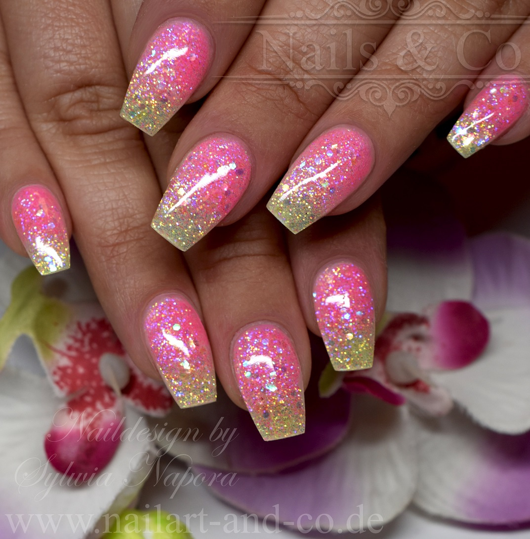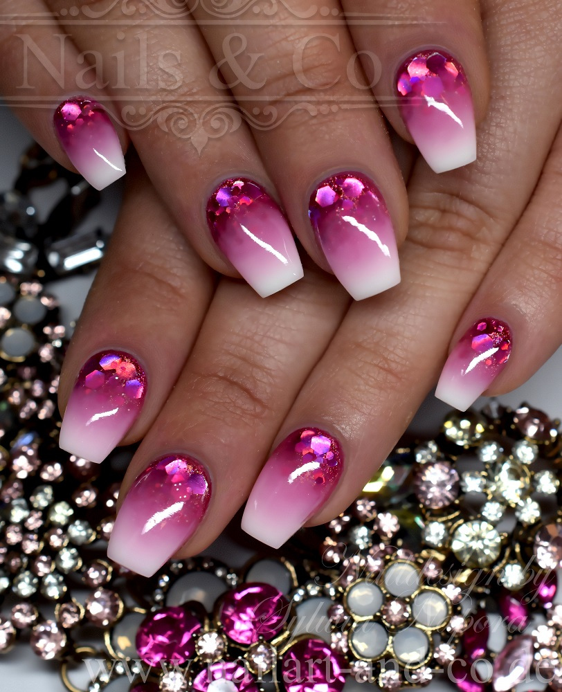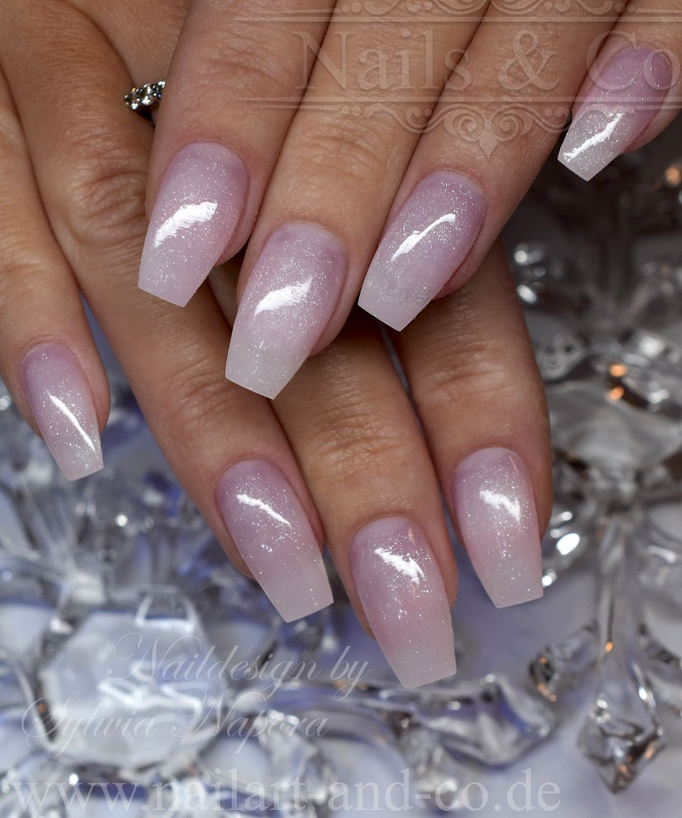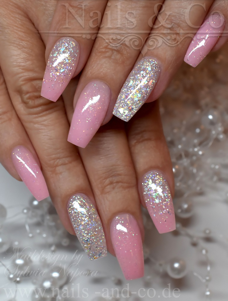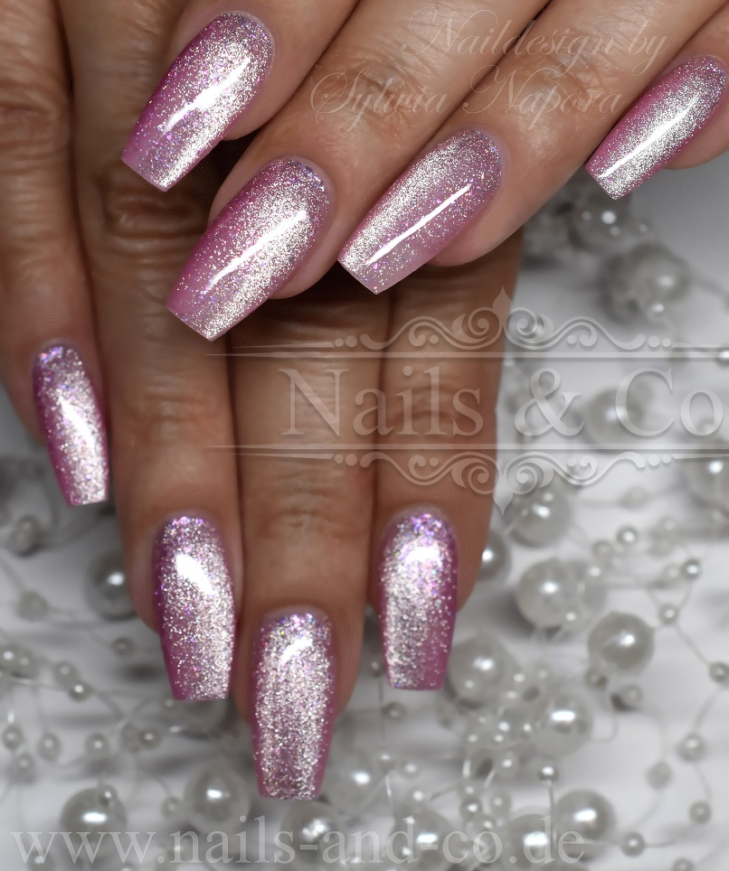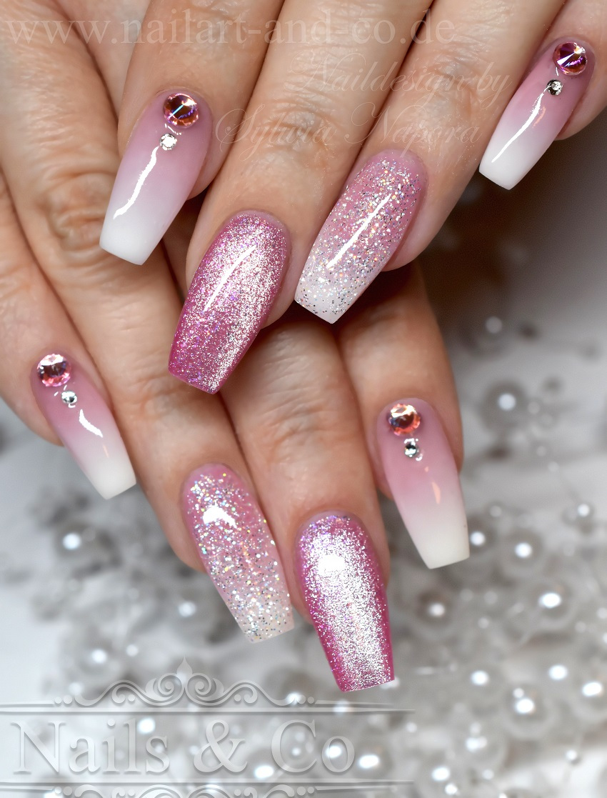 Modern Glam in Rosé. Dieses atemberaubende Nageldesign vereint zarte Farbverläufe in Pink und Weiß mit einem faszinierenden Glanz-Effekt – ein Look, der jugendliche Frische mit trendigem Glamour verbindet. Der sanfte Ombre-Übergang wird durch den schimmernden Perlmuttglanz und subtile Lichtreflexe perfekt in Szene gesetzt. Die klare Formgebung unterstreicht die moderne Eleganz des Designs, während der Hauch von Funkeln jedem Finger einen edlen Touch verleiht. Ideal für alle, die feminine Verspieltheit und einen Hauch Extravaganz stilvoll kombinieren möchten – ein Design, das auffällt, ohne aufdringlich zu sein.