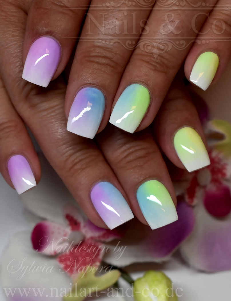 Ein Farbverlauf in Gelb, Orange, Pink und Lila – Diese leuchtenden Nuancen bringen Frische, Wärme und einen Hauch von Frühling auf deine Nägel. ☀️