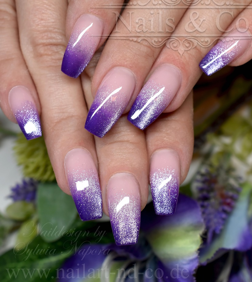 Cat Eye Frarbverlauf Hier ein Cat Eye-Farbverlauf wie ein Sonnenuntergang in Lavendelfeldern: Dieses Nageldesign vereint einen zarten Nude-Ton mit tiefem Violett und einem Katzenaugen Effekt – ein Look, der feminine Eleganz mit kreativer Raffinesse verbindet. Der sanfte Ombre-Effekt schafft einen harmonischen Übergang, während feine Schimmerpartikel für funkelnde Highlights sorgen – die perfekte Wahl für alle, die Farbe lieben – stilvoll, modern und mit einem Hauch Magie auf jeder Fingerspitze.