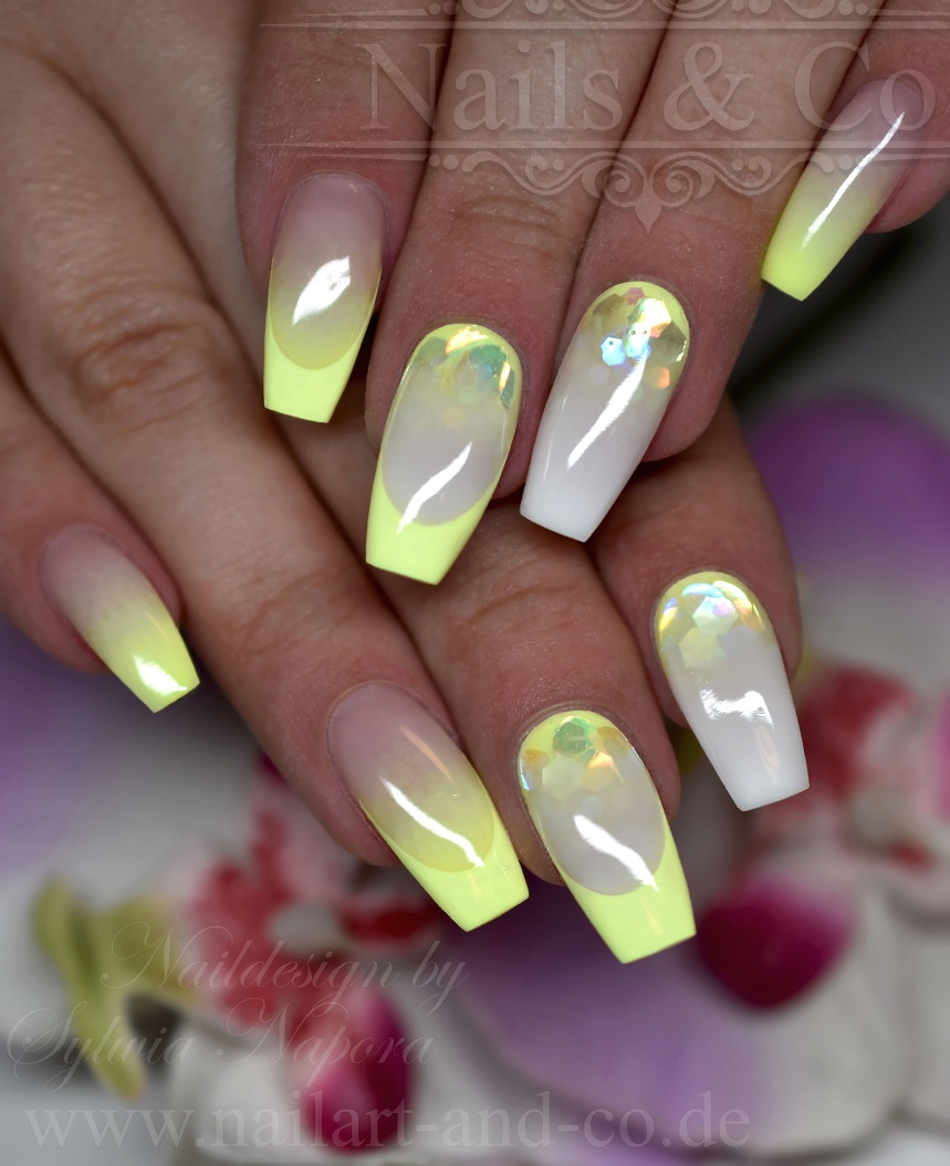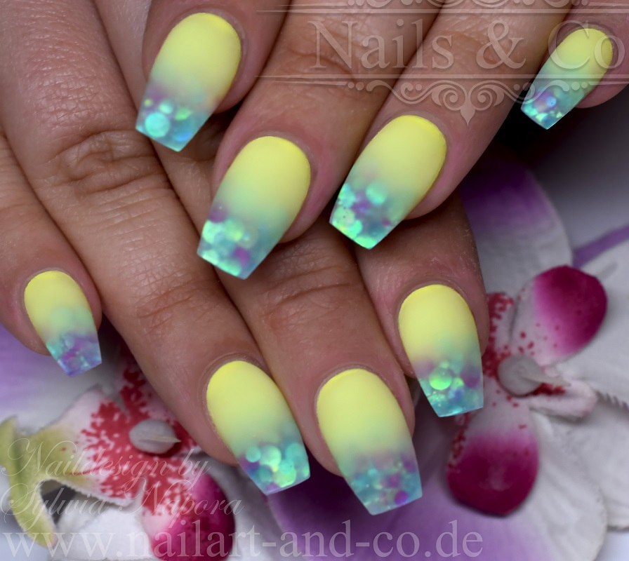Frische Farben, sommerliches Flair. Dieses außergewöhnliche Nageldesign bringt pure Sommerlaune auf die Fingerspitzen! Ein leuchtendes Zitronengelb verschmilzt sanft mit einem türkisfarbenen Glaseffekt, der durch irisierende Partikel an tropisches Wasser erinnert. Der matte Finish sorgt für eine moderne, samtige Optik, während die Farbverläufe an Sonnenuntergänge am Meer erinnern. Das ist der perfekte Look für alle, die mutig Farbe bekennen und mit ihrem Style Leichtigkeit, Lebensfreude und Kreativität ausstrahlen möchten. Ideal für Urlaub, Festival oder einfach gute Laune im Alltag!
