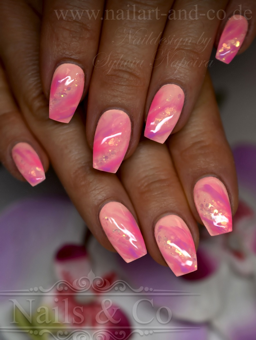 Dieses elegante Nageldesign vereint zarte Raffinesse mit funkelndem Glamour. Die Basis in einem sanften Rosé-Ton wird kunstvoll durchzogen von feinen, weißen Marmor-Effekten, die einen Hauch von Luxus ausstrahlen. Akzentnägel mit schimmernden Glitzerpartikeln und funkelnden Pailletten setzen glanzvolle Highlights und verleihen dem Design eine festliche Note. Perfekt für besondere Anlässe oder um dem Alltag stilvoll zu entfliehen.