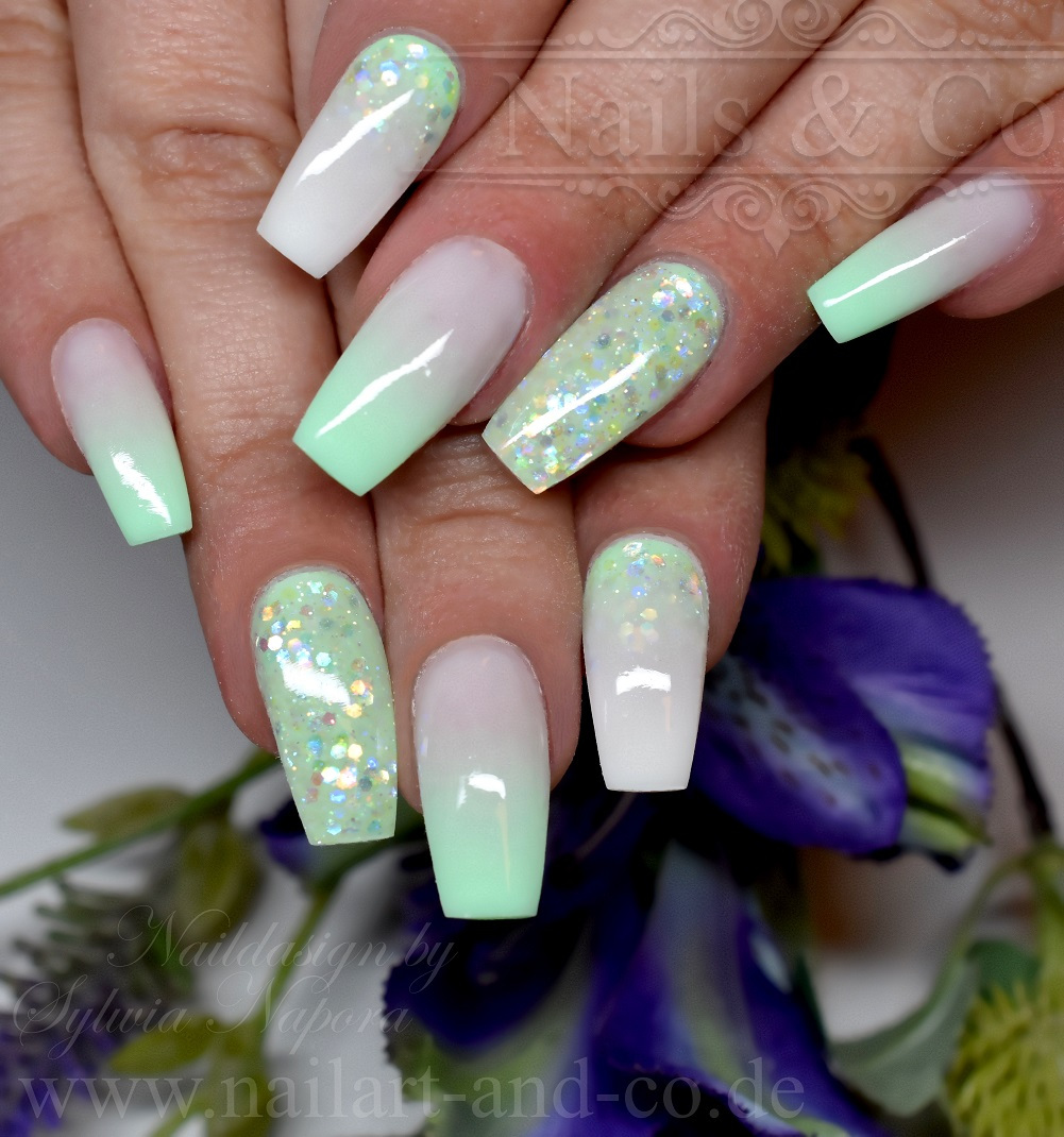 Das ist die perfekte Wahl für alle, die Leichtigkeit und Eleganz verbinden möchten. Ideal für Frühling, Sommer oder einfach einen frischen Auftritt mit Wow-Effekt. Dieses frühlingshafte Nageldesign kombiniert einen zarten Farbverlauf in kühlem Mint mit funkelnden Glitzerakzenten in holografischem Schimmer. Die sanfte Ombre-Basis wirkt leicht und elegant, während die glitzernden Highlight-Nägel für einen modernen, verspielten Touch sorgen. Das glänzende Finish rundet den Look perfekt ab – stilvoll, erfrischend und lebendig.