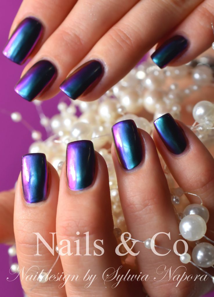 Bunt schimmerndes Nageldesign mit Chamäleon Chrome Effekt.